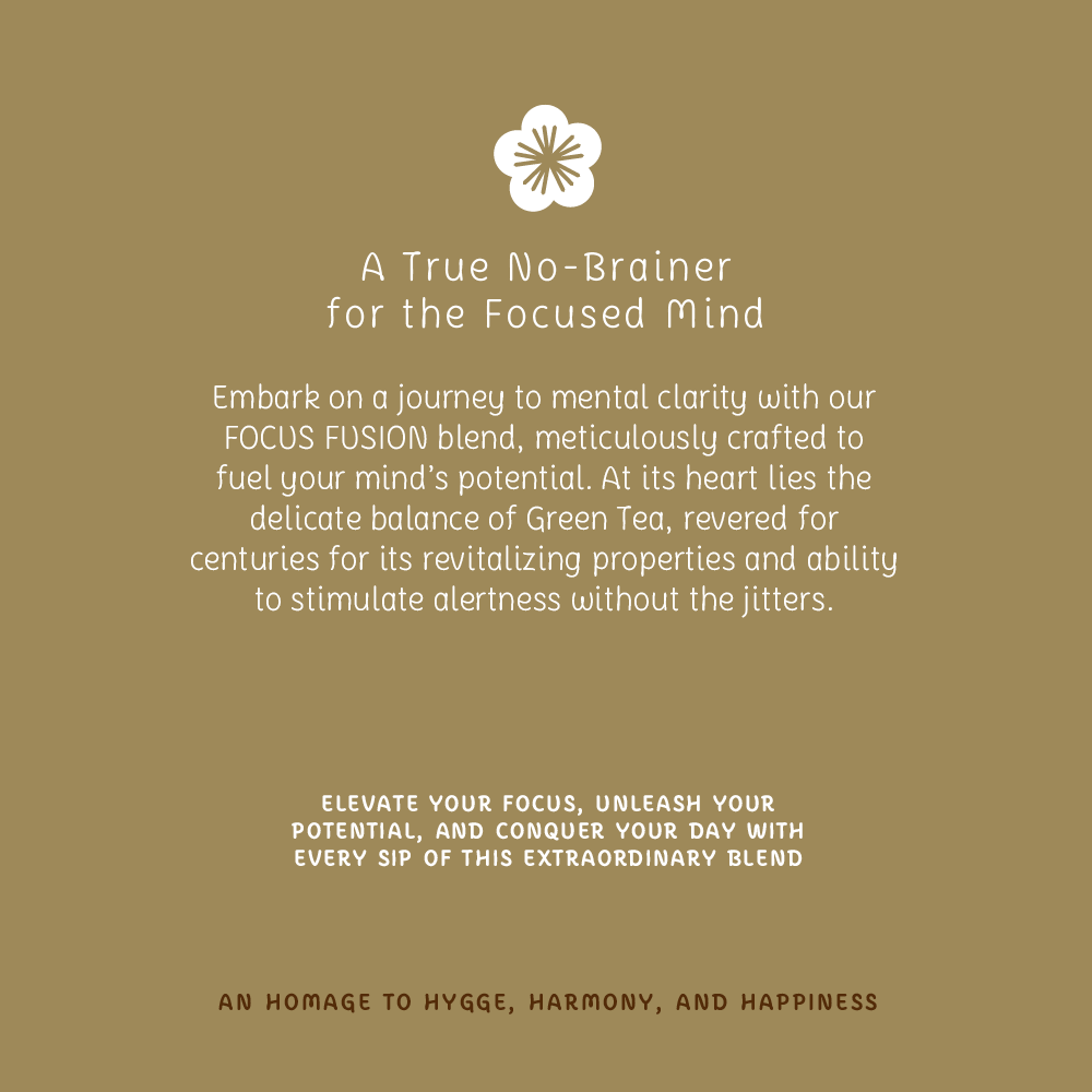 Unlock your mind's full potential with FOCUS FUSION, a meticulously crafted tea designed to support clarity and concentration. This powerful blend features double-extracted Lion’s Mane Mushroom, renowned for its cognitive-enhancing benefits, alongside Ceylon Green Sencha Tea, which offers a smooth, revitalizing boost of energy without the jitters.