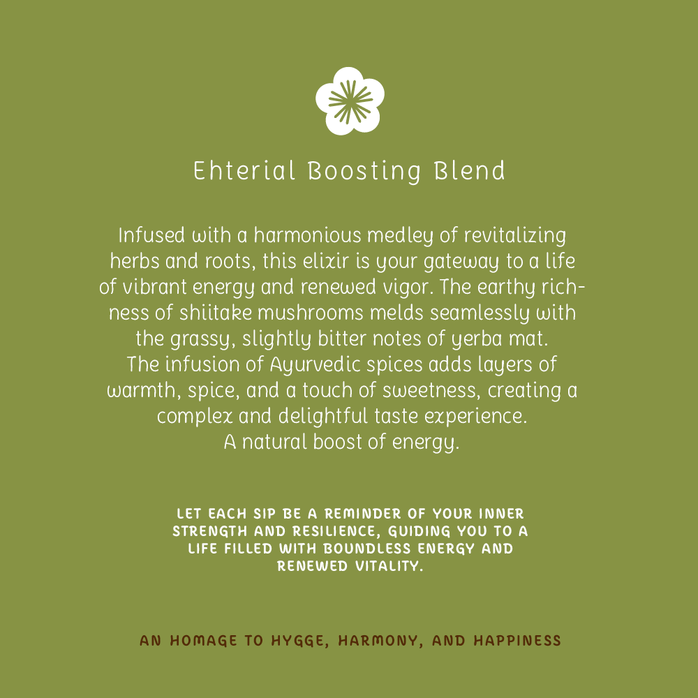 MATÉ MAGIC is a naturally energizing tea blend designed to elevate your vitality and refresh your senses. This ethereal elixir combines the earthy depth of Shiitake mushroom extract with the grassy, slightly bitter flavor of Yerba Maté, offering a balanced, invigorating experience. Infused with Ayurvedic spices like Cinnamon, Hibiscus, and Sweet Neem, it delivers a warm, comforting taste with a hint of citrus from Lemongrass and Lemon Balm. Perfect for those seeking a natural energy boost,