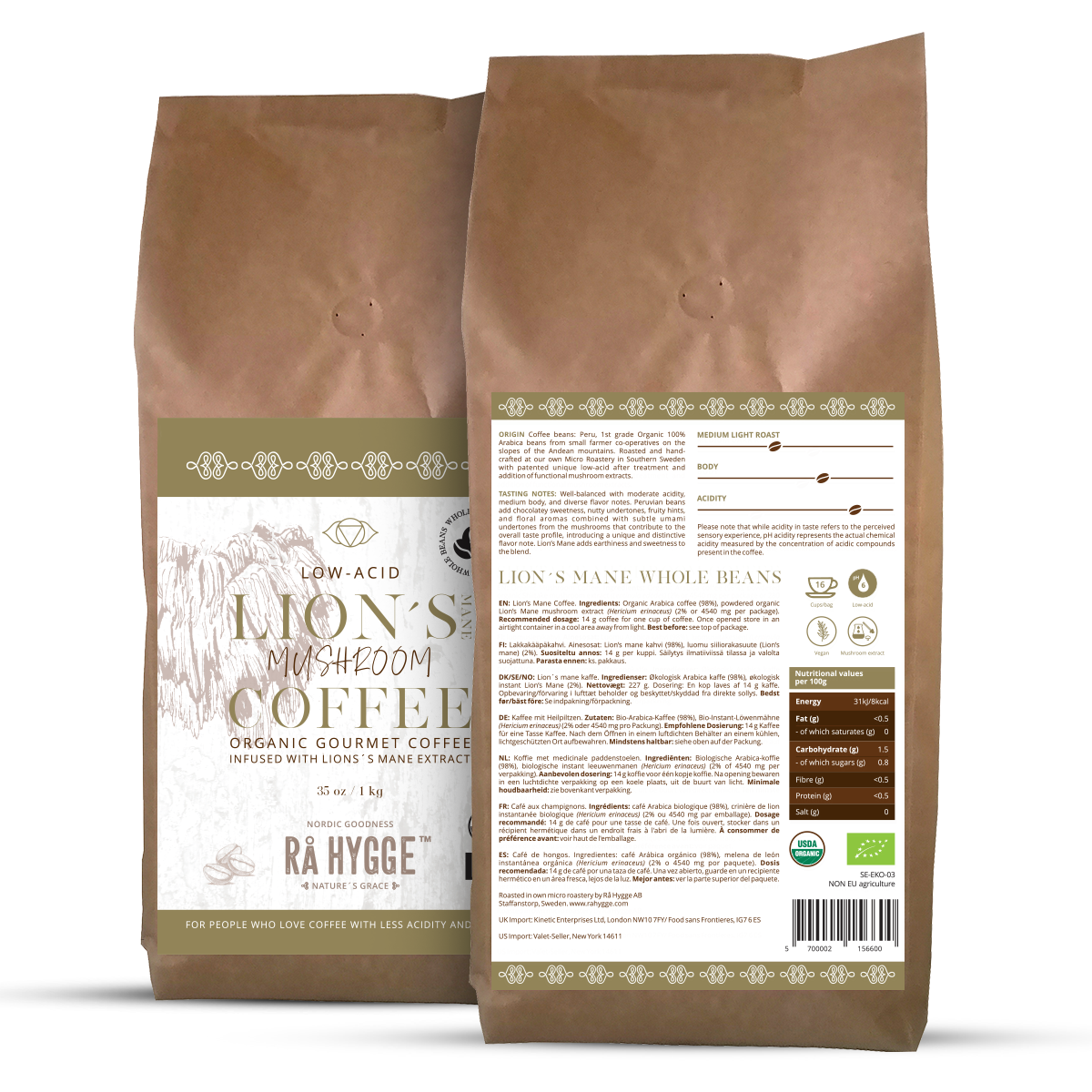 (SE: Ingredienser: Ekologiskt Arabica kaffe (98%), ekologisk instant Lion's Mane (2%))